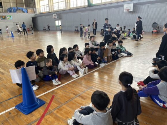 今回は地域で千刈小学校と連携している3施設合同での交流会となりました。園のホールの何倍も大きな体育館を使って、運動やランドセルに触れる機会等、子どもたちが興味深く楽しめる企画を準備して下さいました。