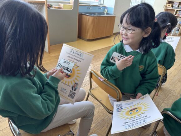 卒園が近づくにつれ、園生活最後の時間も増えていきます。今日はミハイ先生と最後の英語の時間。修了証書をいただきました!