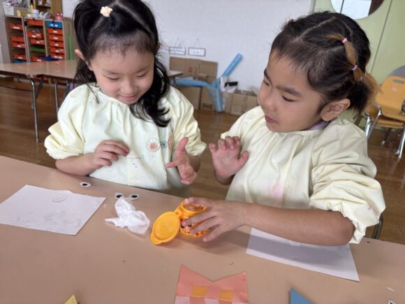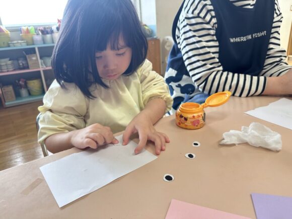 年長組が昨日に続いてこいのぼり制作中!今日は目をつけるところまで。